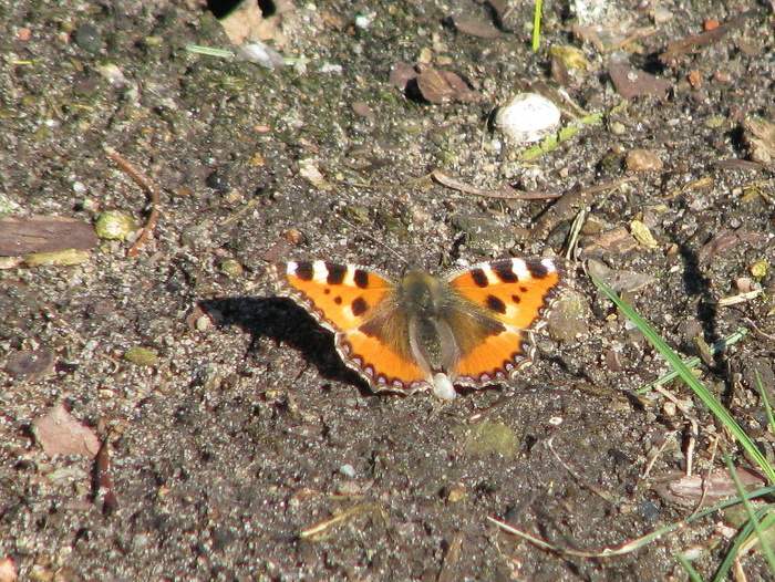 Dann sah ich den ersten Falter dieses Jahr. Ein "Kleiner Fuchs" sonnte sich auf meinem Kartoffelbeet. Auch ein Zitronenfalter flog an mir vorbei, er wollte aber nicht fotografiert werden.