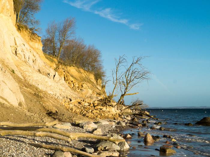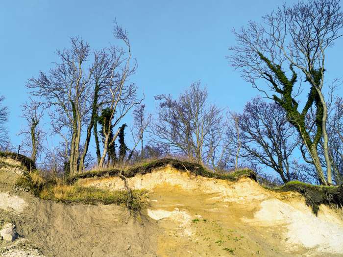 | Nun wurde der Strand breiter. Hier hat sich das Kliff auch ein wenig beruhigt, es kommt seltener zu Abbrüchen. |
