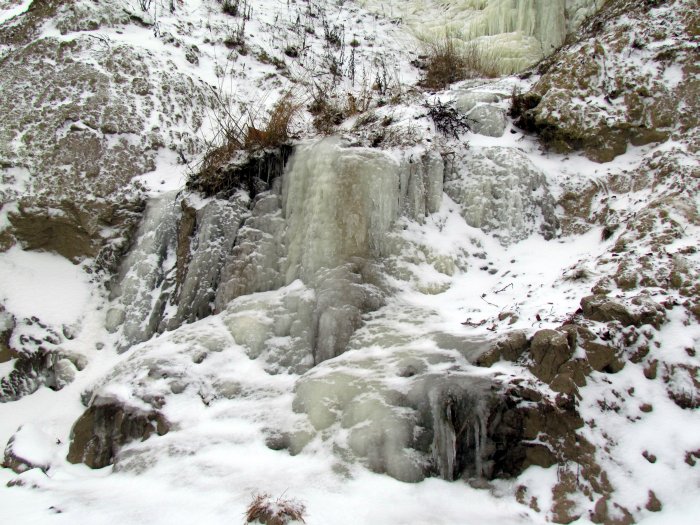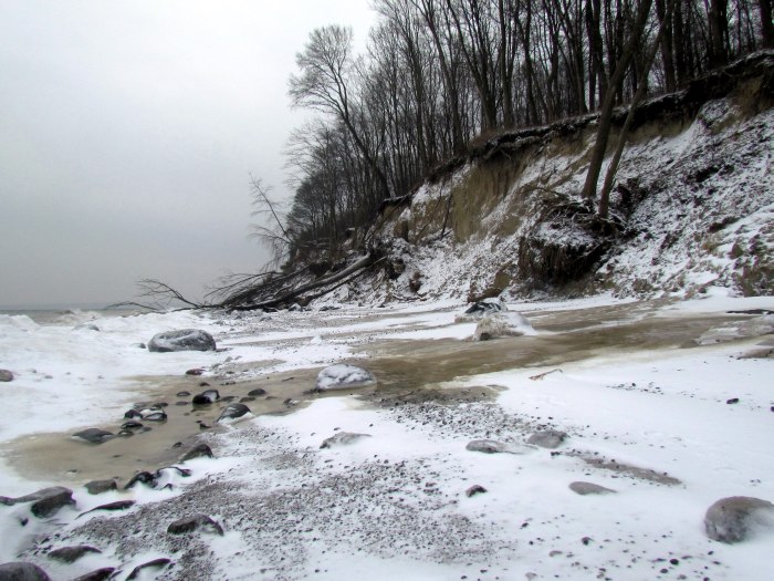 | Dort, wo Wasser den Hang heruntergekommen war, hatten sich breite Eisflächen über die ganze Breite des Strandes gebildet. Es war teilweise sehr rutschig. |