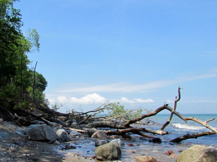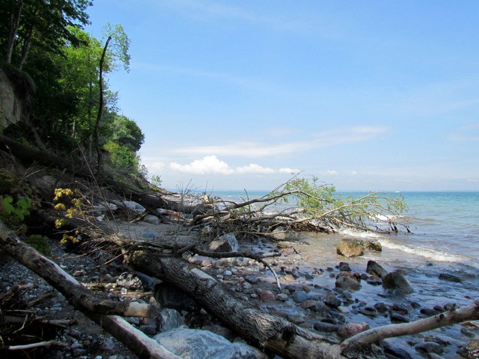 | Hier kroch ich durch einen belaubten Baum hindurch, der noch halb auf der Steilküste lag. Ein wenig mulmig war mir schon, denn die Wand war noch total durchweicht. Ich dachte daran, dass die Bäume nachsacken könnten, während ich unter ihnen herumkrabbelte. |
