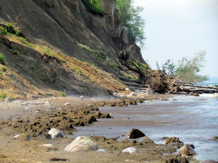 | Die Steilwand war auch noch nicht abgetrocknet, so dass mit weiteren Abbrüchen gerechnet werden musste. Die drei Steine, die oben zu sehen sind, habe ich sehr argwöhnisch im Visier gehabt. |