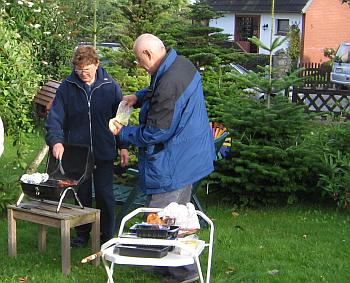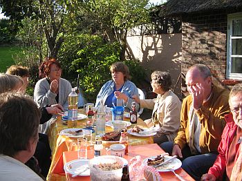 einen Strich durch die Rechnung. Doch sobald die Sonne schien, stellten wir Tische und Stühle auf und nahmen den Grill in Betrieb. Immer wieder mussten wir vor einem Schauer flüchten, doch das tat unserer guten Laune keinen Abbruch. Da genug Salat vorhanden war, beruhigten wir unsere knurrenden Mägen damit.